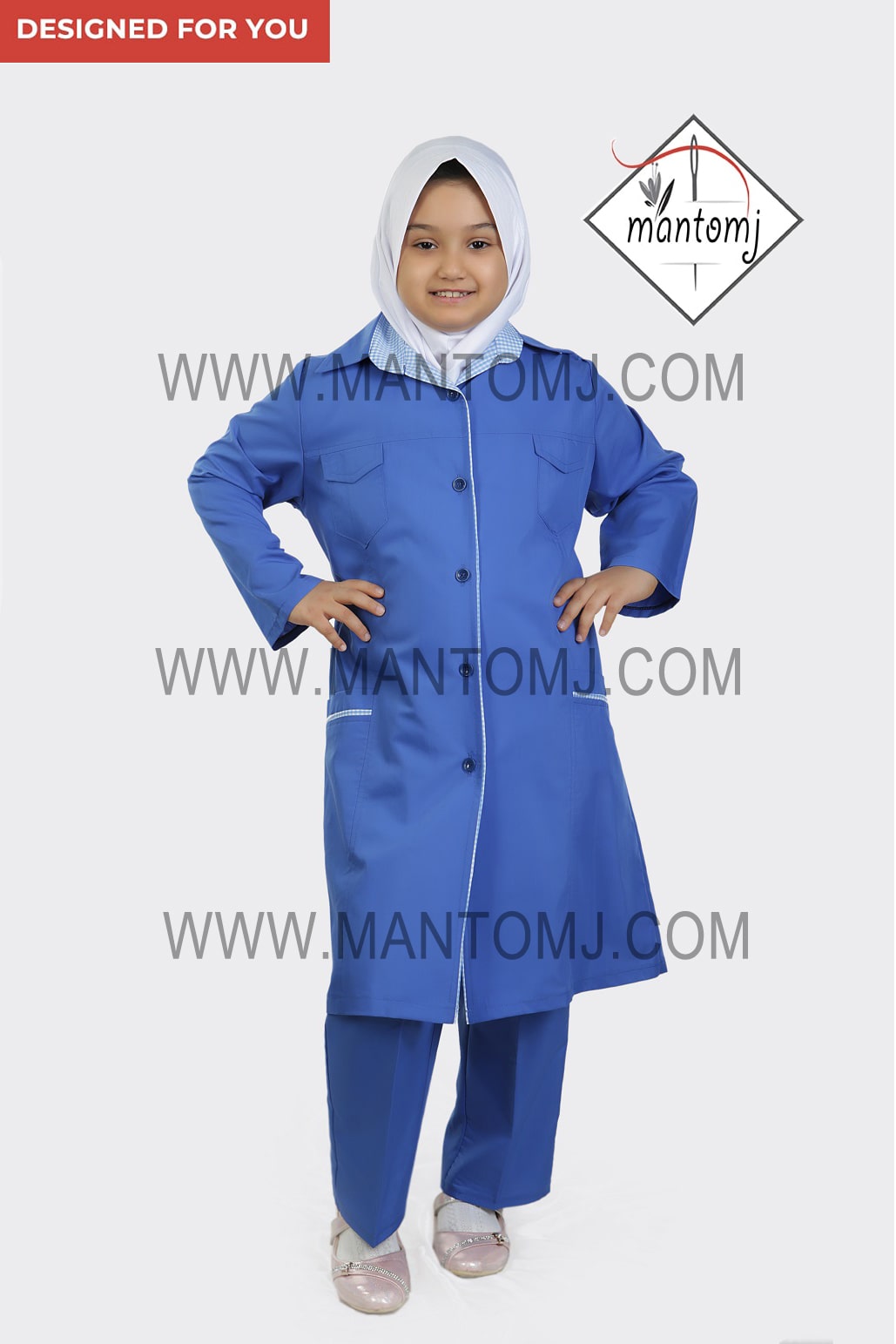 لباس مدرسه کد 7039 یک مانتو شلوار مدرسه با تل آنجل است که مناسب مدارس ابتدایی و دوره اول دبیرستان می باشد. جنس پارچه لباس فرم مدرسه از نوع ترگال